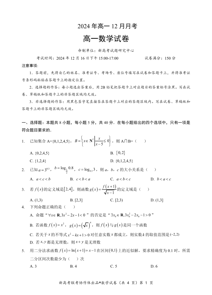 湖北省新高考联考协作体2024-2025学年高一上学期12月联考数学
