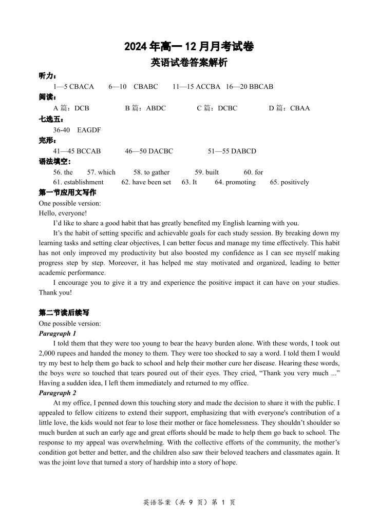 湖北省新高考联考协作体2024-2025学年高一上学期12月联考英语答案