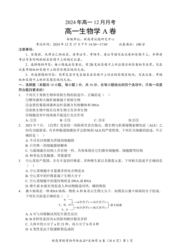 湖北省新高考联考协作体2024-2025学年高一上学期12月联考生物A