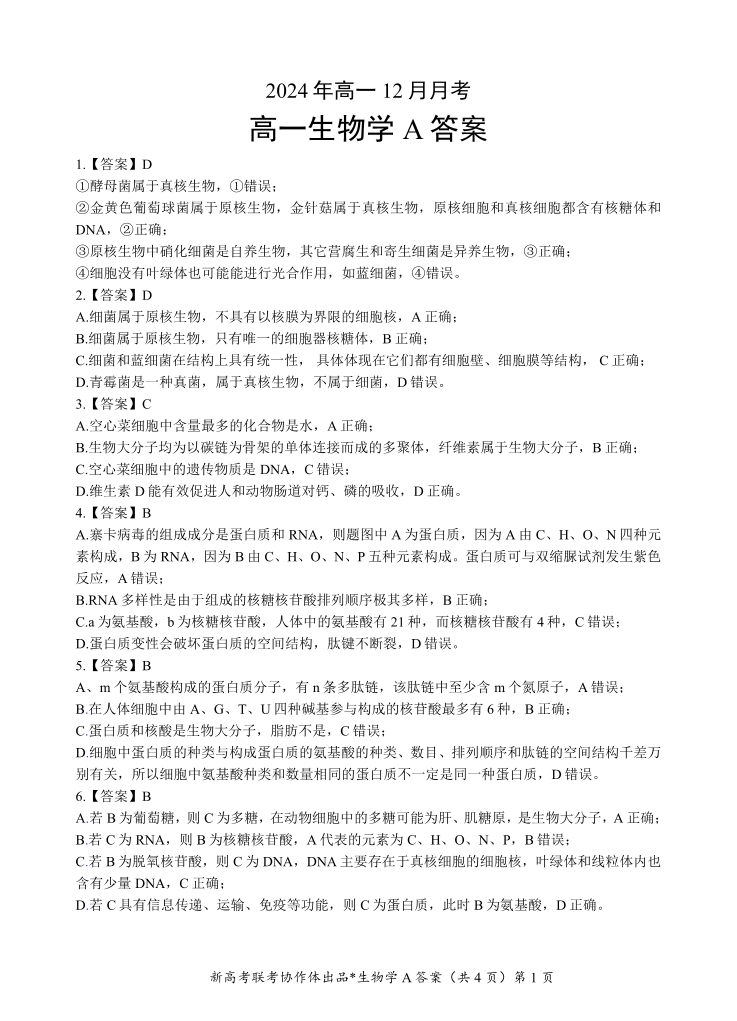 湖北省新高考联考协作体2024-2025学年高一上学期12月联考生物A答案