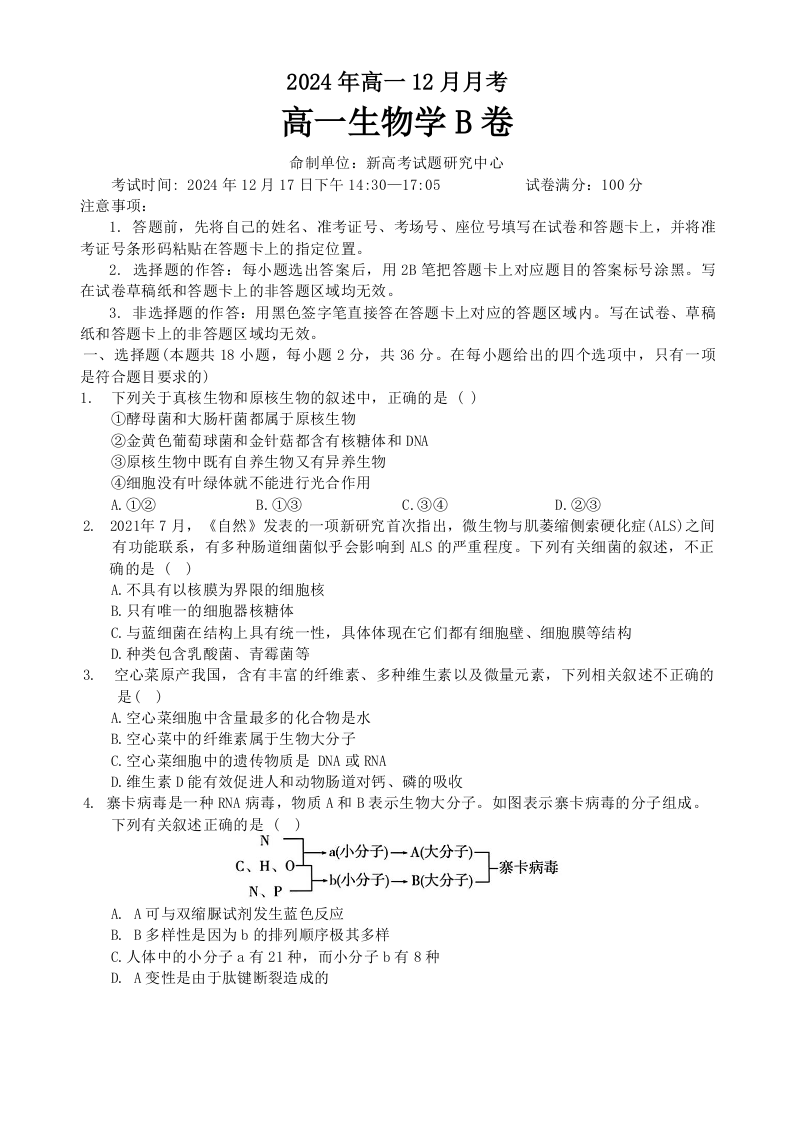 湖北省新高考联考协作体2024-2025学年高一上学期12月联考生物(B卷)