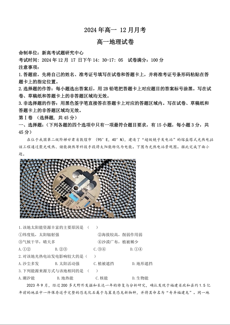 湖北省新高考联考协作体2024-2025学年高一上学期12月联考地理+答案