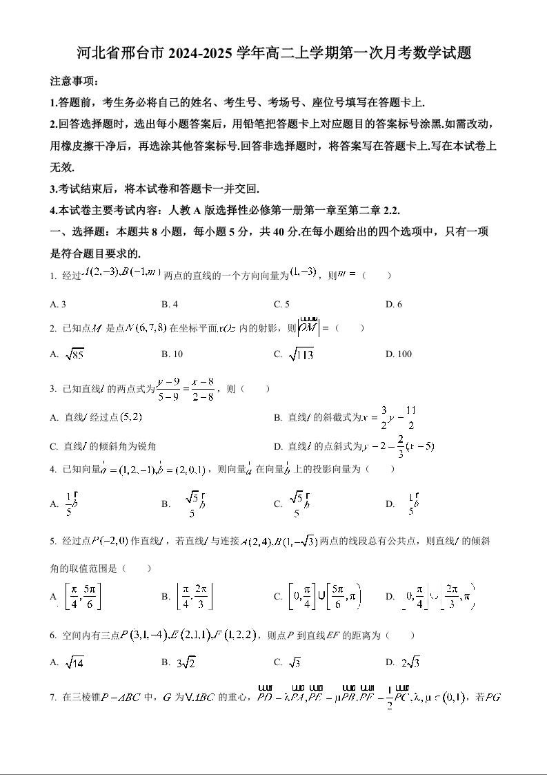河北省邢台市2024-2025学年高二上学期第一次月考数学(原卷版)