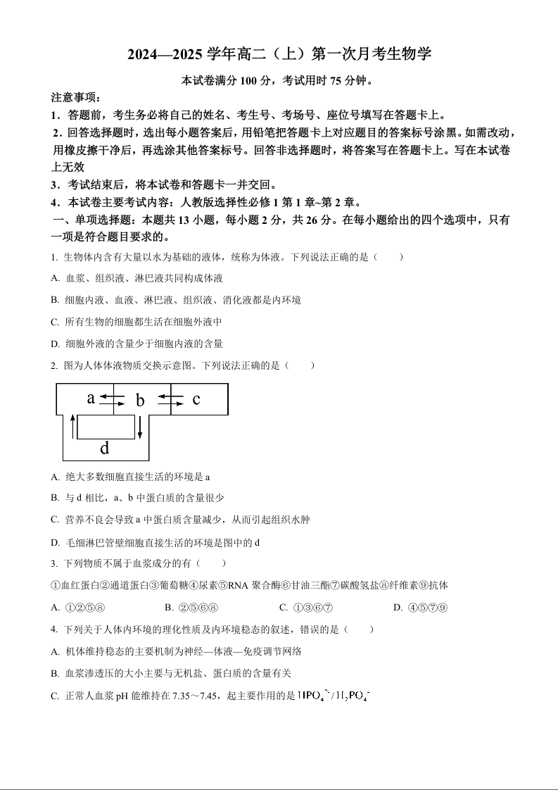 河北省邢台市2024-2025学年高二上学期第一次月考生物(原卷版)