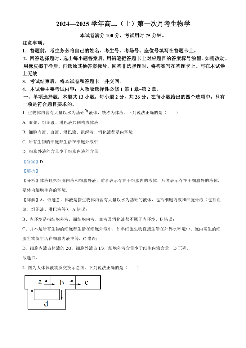 河北省邢台市2024-2025学年高二上学期第一次月考生物(解析版)