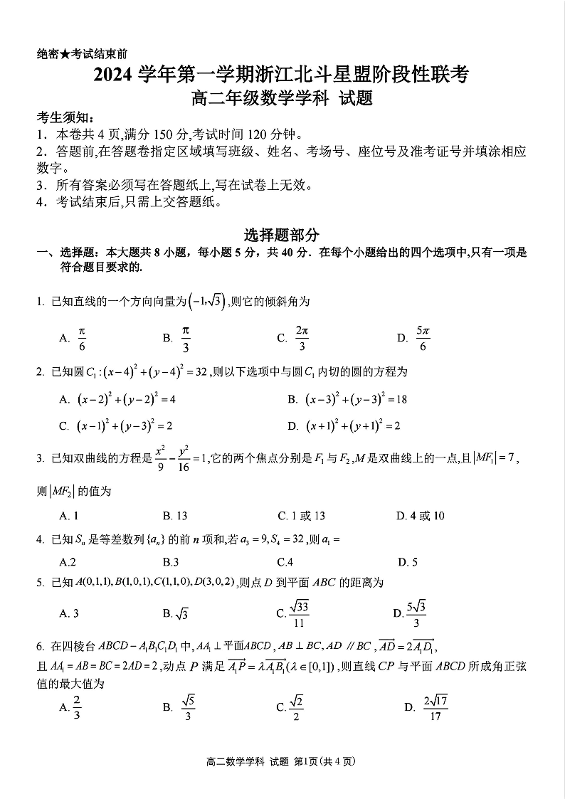 (已压缩)浙江北斗星盟阶段性联考2024-2025学年高二联考试题数学