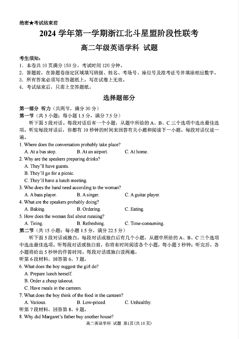 (已压缩)浙江北斗星盟阶段性联考2024-2025学年高二联考试题英语