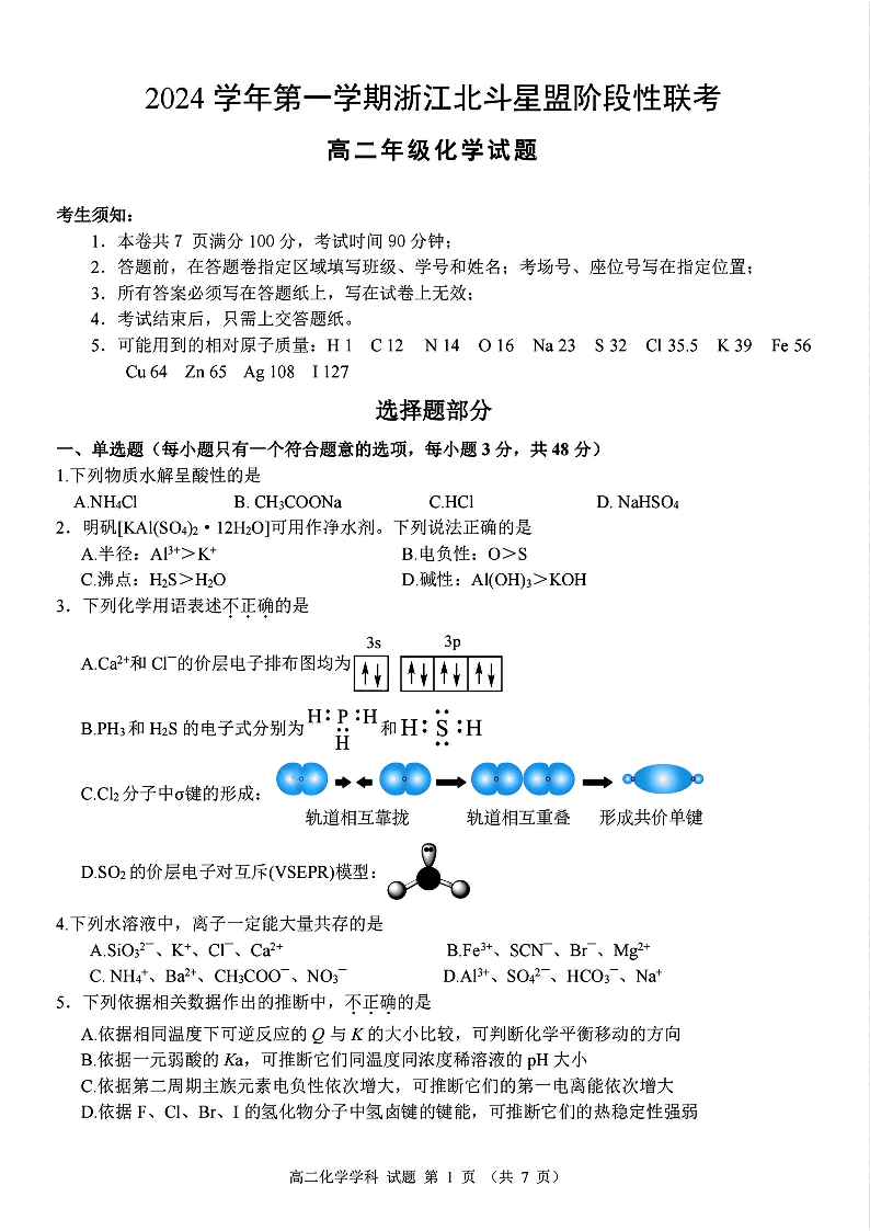 (已压缩)浙江北斗星盟阶段性联考2024-2025学年高二联考试题化学