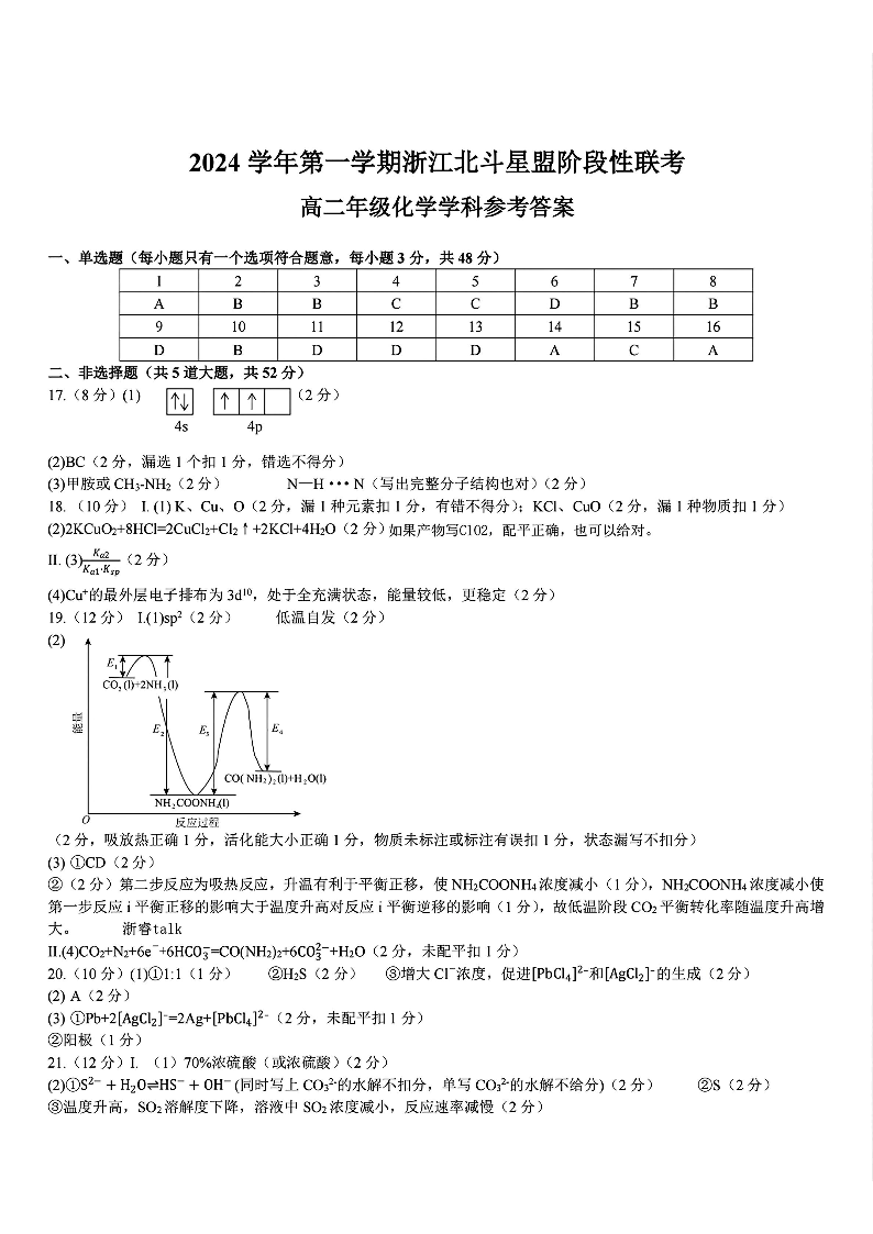 (已压缩)浙江北斗星盟阶段性联考2024-2025学年高二联考试题化学答案