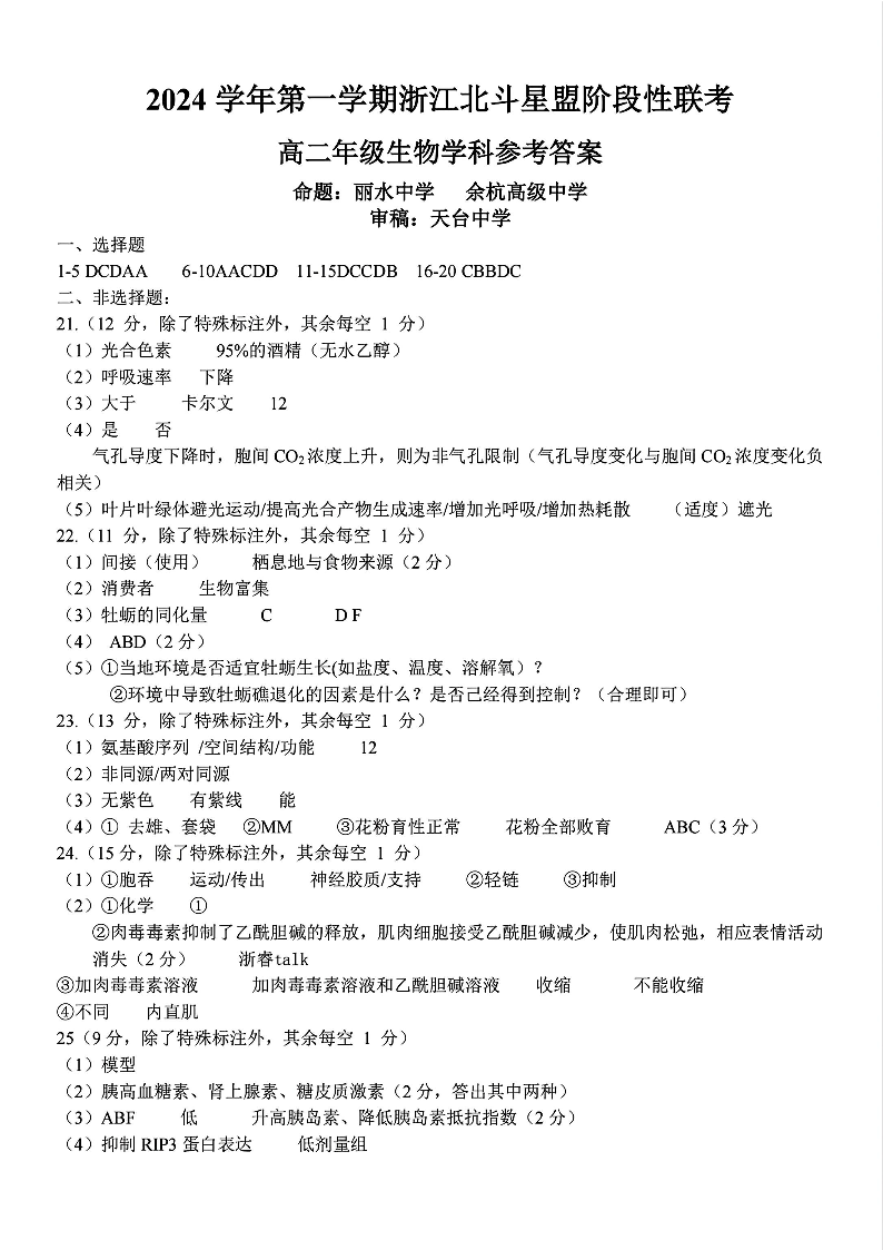 (已压缩)浙江北斗星盟阶段性联考2024-2025学年高二联考试题生物答案