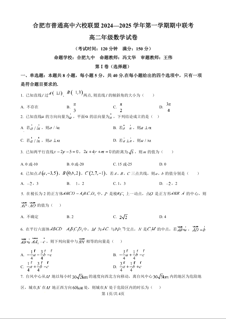 安徽省合肥市普通高中六校联盟2024-2025学年高二第一学期期中联考数学试题(原卷版)