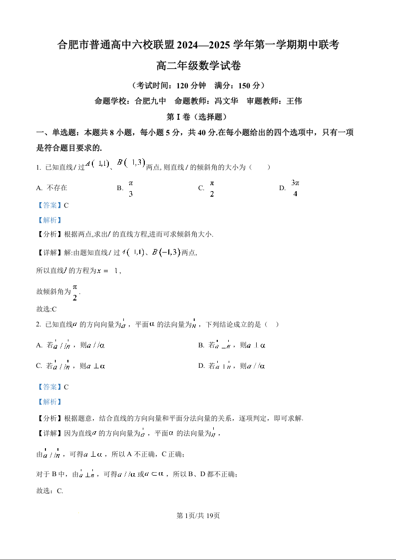 安徽省合肥市普通高中六校联盟2024-2025学年高二第一学期期中联考数学试题(解析版)