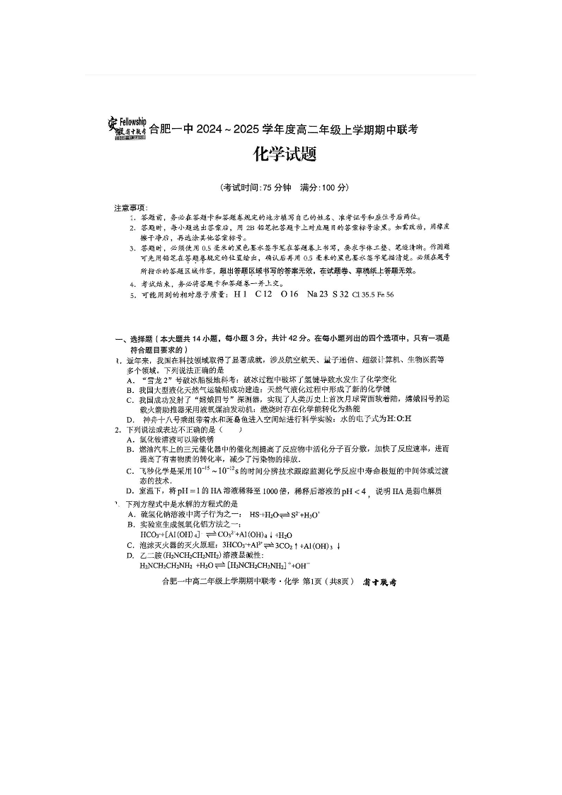 安徽省合肥一中2024-2025学年度高二年级上学期期中联考化学+答案