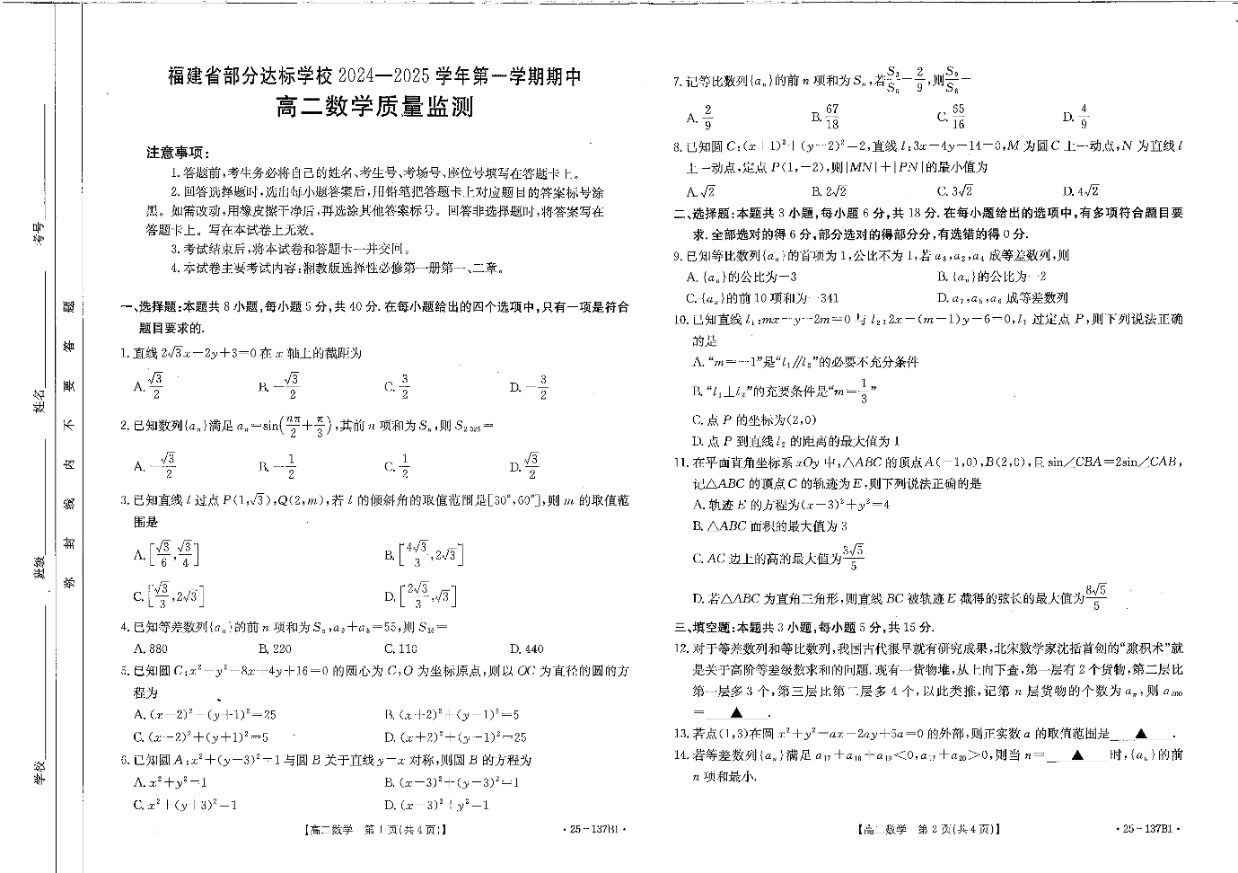 福建省部分达标学校2024-2025学年第一学期期中考试数学