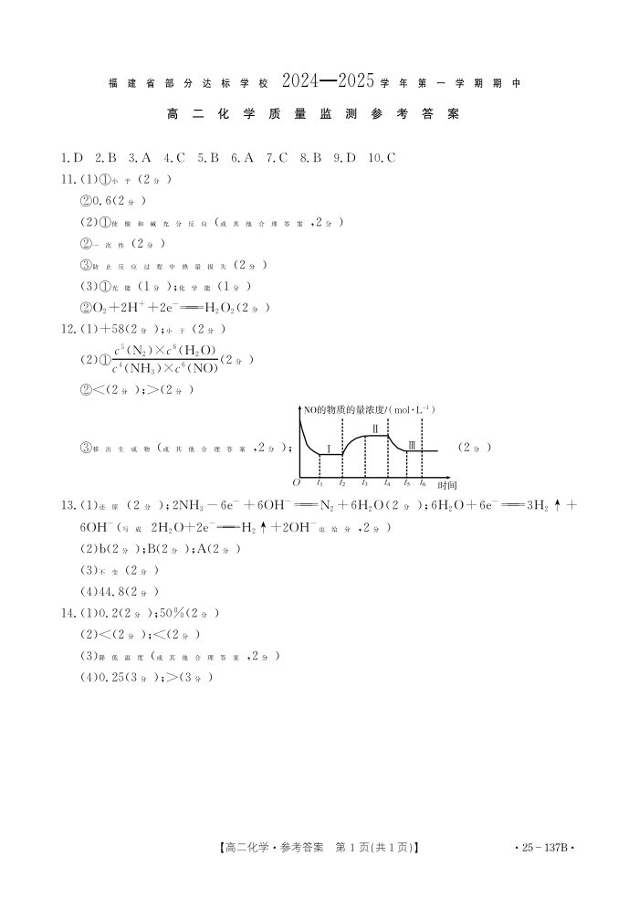 福建省部分达标学校2024-2025学年第一学期期中考试化学答案
