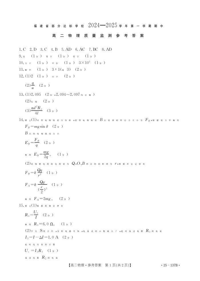 福建省部分达标学校2024-2025学年第一学期期中考试物理答案