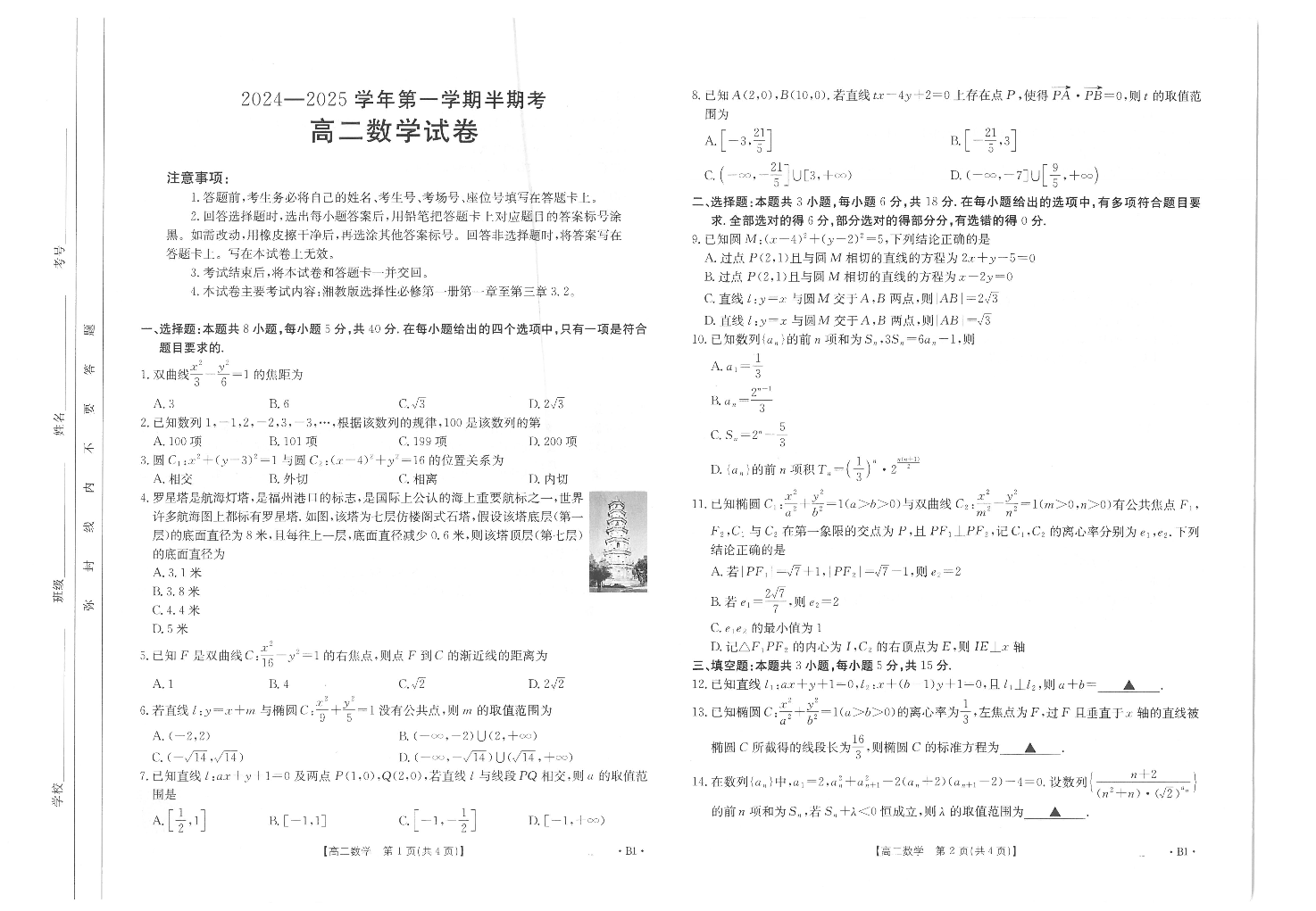 福建省部分高中2024-2025学年第一学期半期考数学