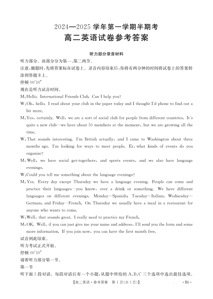 福建省部分高中2024-2025学年第一学期半期考英语答案