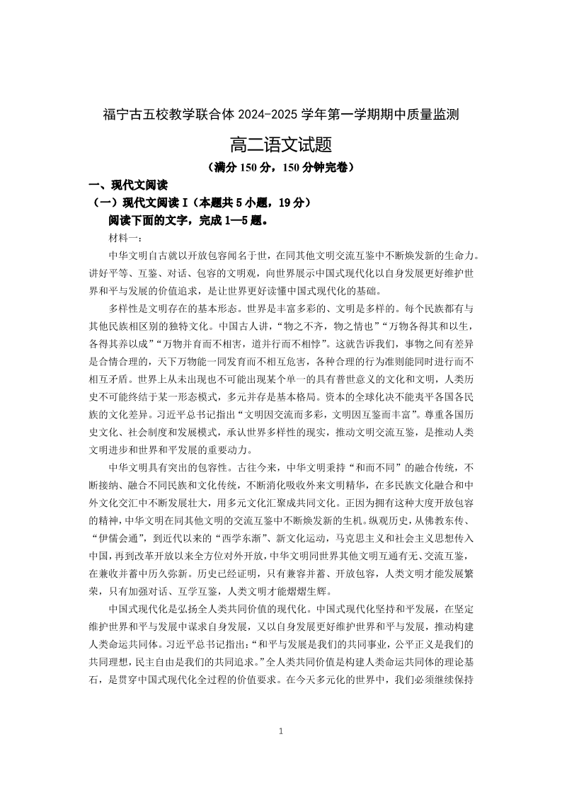 福建省福宁古五校教学联合体2024-2025学年第一学期期中质量检测语文