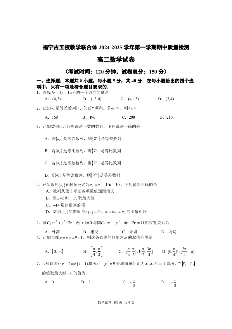 福建省福宁古五校教学联合体2024-2025学年第一学期期中质量检测数学