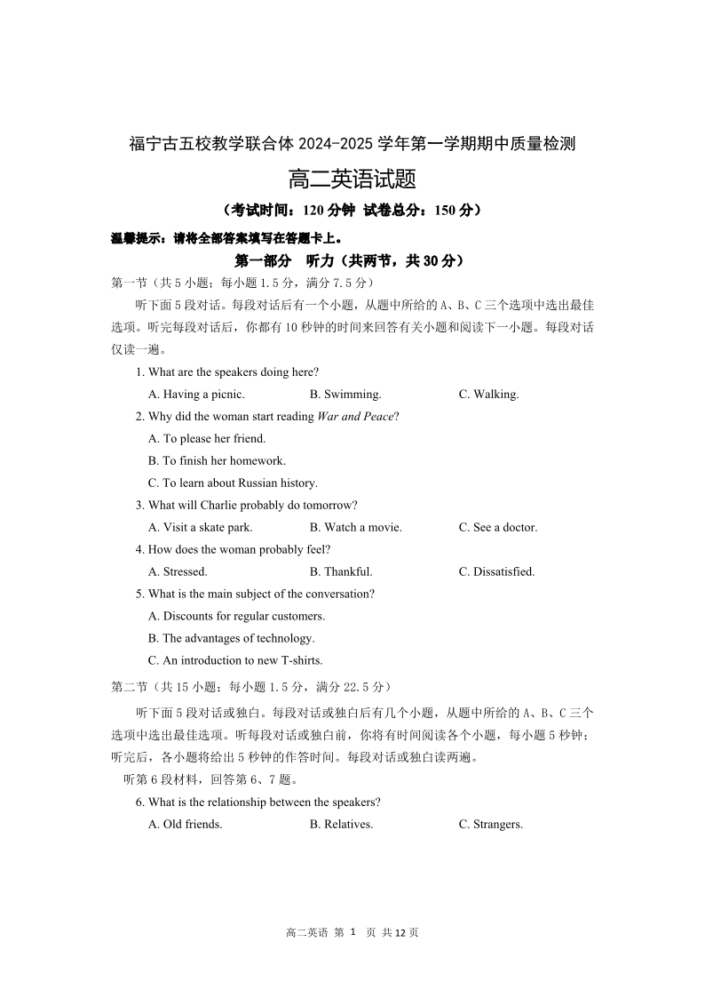 福建省福宁古五校教学联合体2024-2025学年第一学期期中质量检测英语