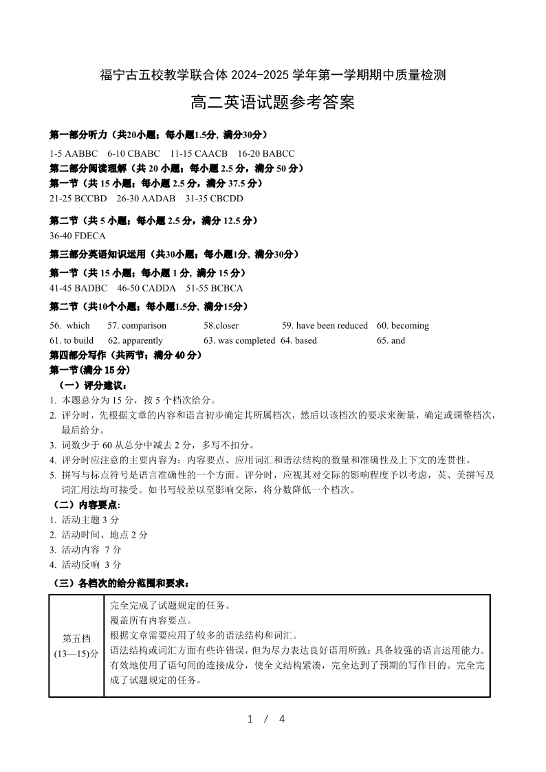 福建省福宁古五校教学联合体2024-2025学年第一学期期中质量检测英语答案