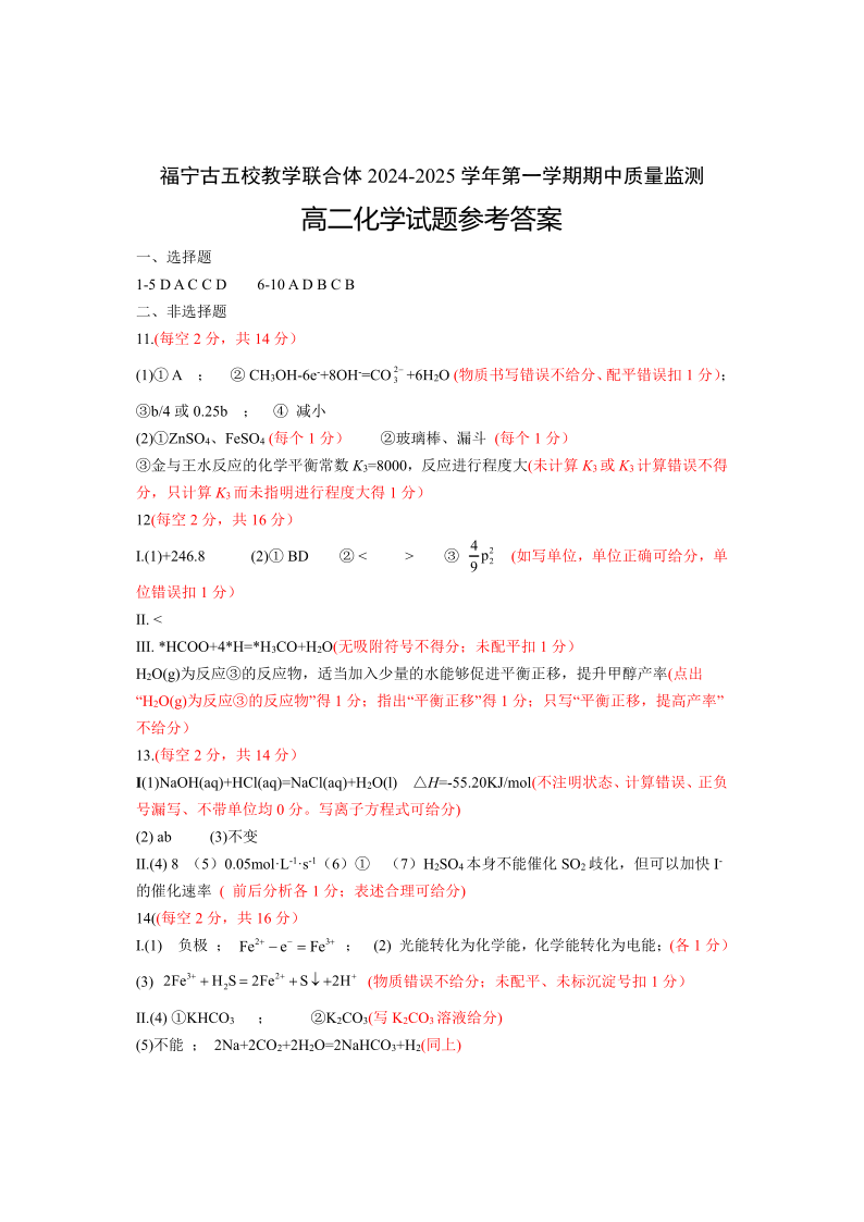 福建省福宁古五校教学联合体2024-2025学年第一学期期中质量检测化学答案