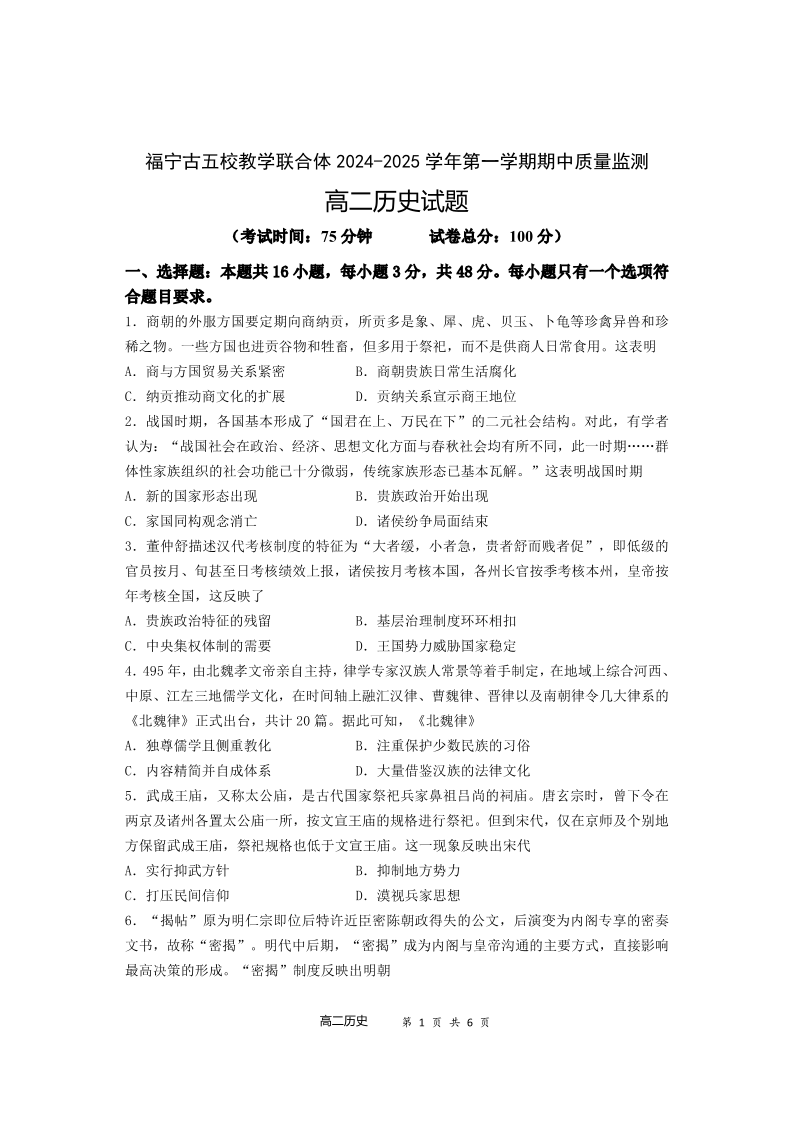 福建省福宁古五校教学联合体2024-2025学年第一学期期中质量检测历史