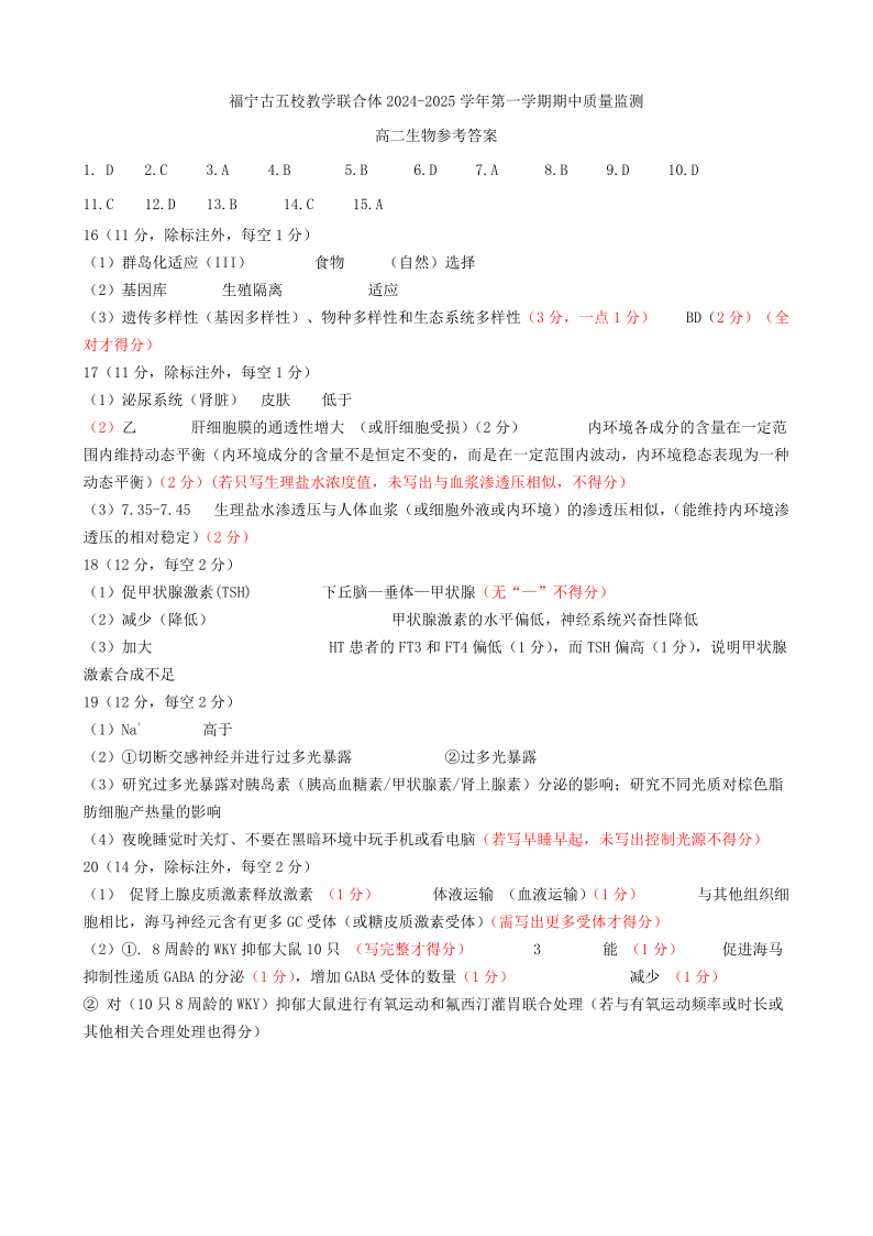 福建省福宁古五校教学联合体2024-2025学年第一学期期中质量检测生物答案