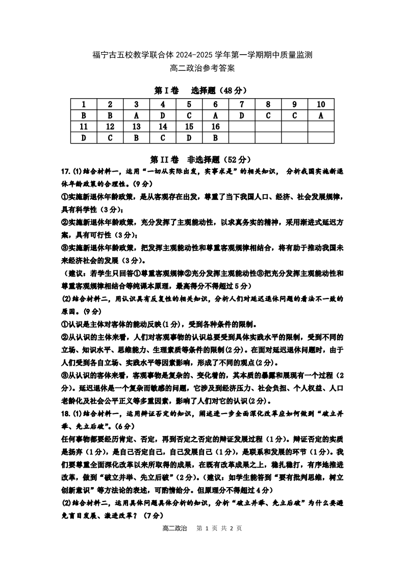 福建省福宁古五校教学联合体2024-2025学年第一学期期中质量检测政治答案