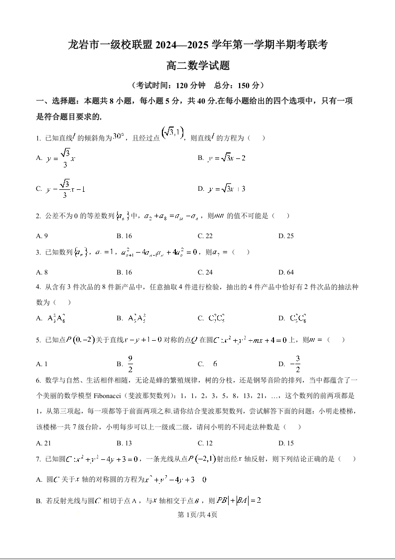 福建省龙岩市一级校联盟2024-2025学年第一学期半期考联考数学试题(原卷版)