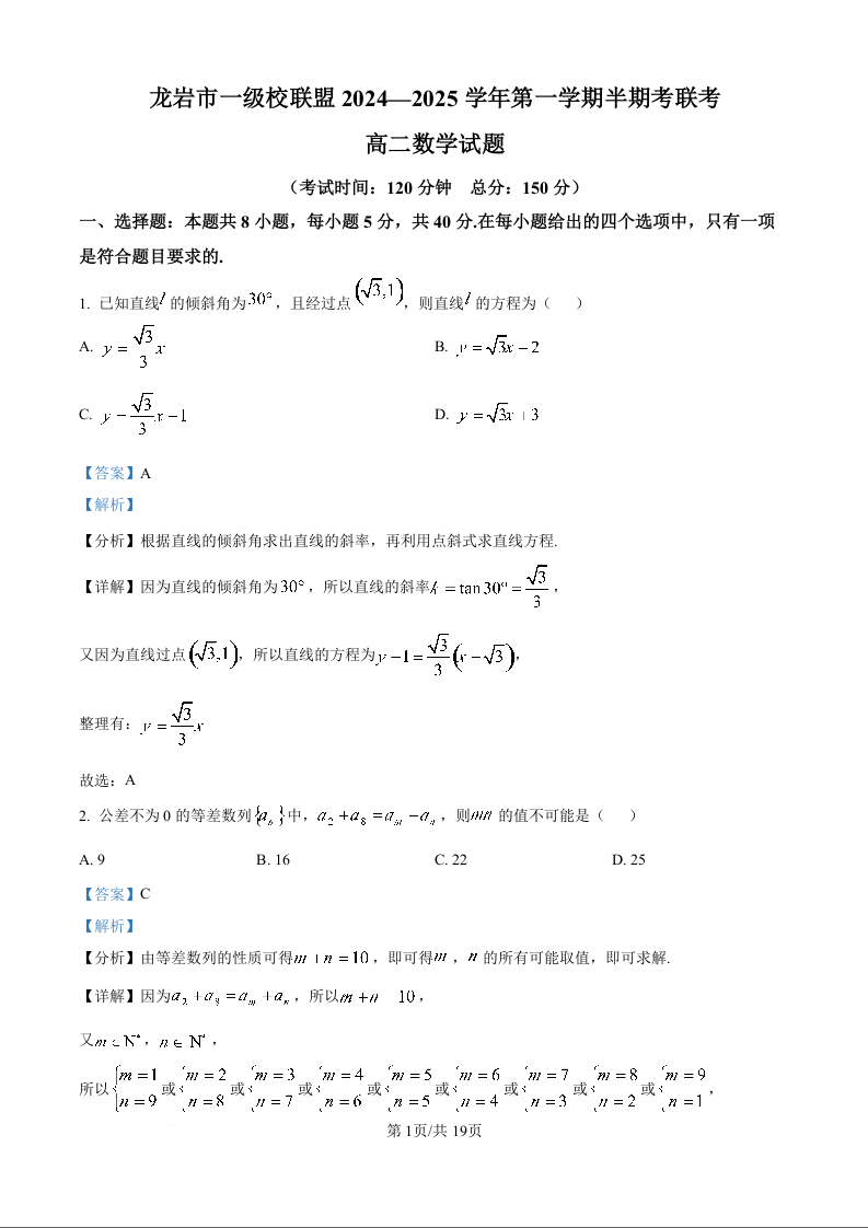 福建省龙岩市一级校联盟2024-2025学年第一学期半期考联考数学试题(解析版)