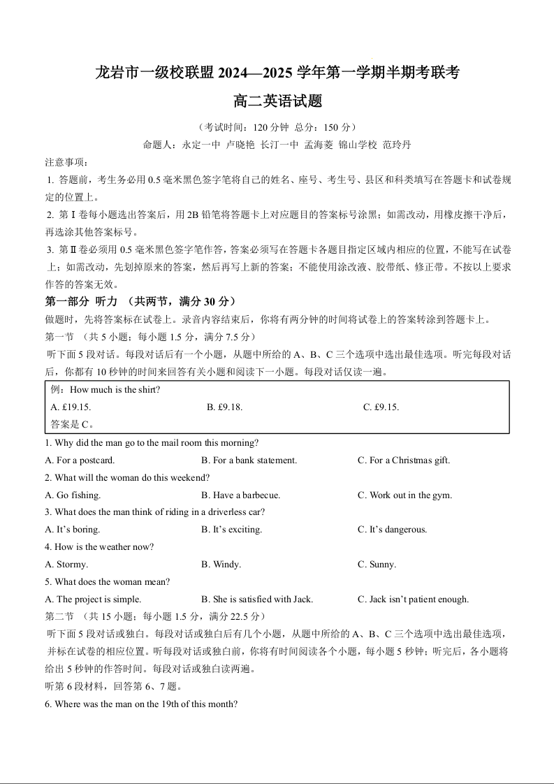 福建省龙岩市一级校联盟2024-2025学年第一学期半期考联考英语+答案