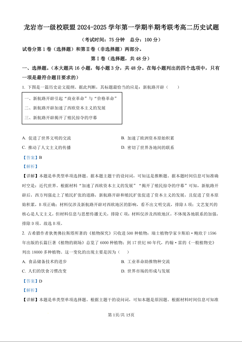 福建省龙岩市一级校联盟2024-2025学年第一学期半期考联考历史试题(解析版)