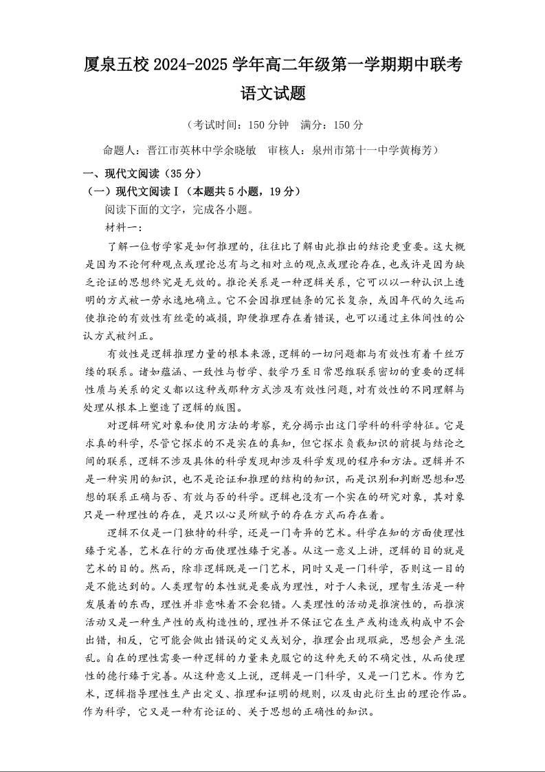 福建省厦泉五校2024-2025学年高二年级第一学期期中联考语文+答案