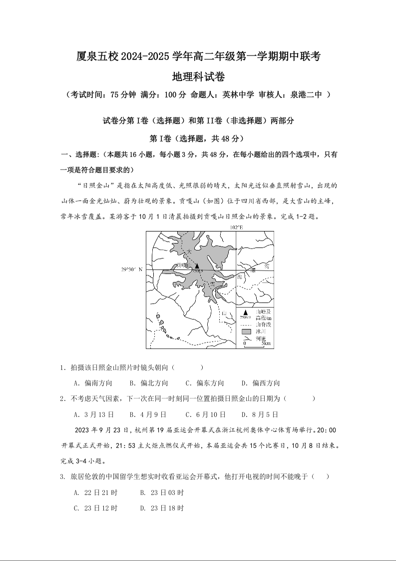 福建省厦泉五校2024-2025学年高二年级第一学期期中联考地理+答案