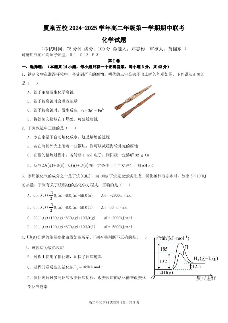 福建省厦泉五校2024-2025学年高二年级第一学期期中联考化学+答案