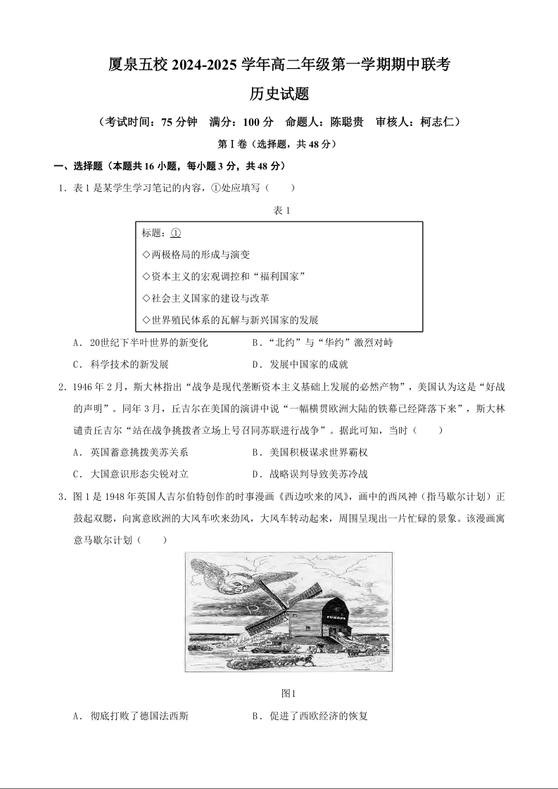 福建省厦泉五校2024-2025学年高二年级第一学期期中联考历史+答案