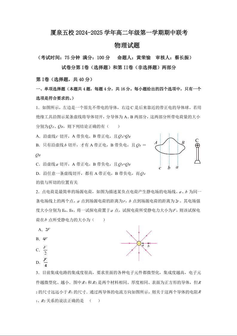 福建省厦泉五校2024-2025学年高二年级第一学期期中联考物理+答案