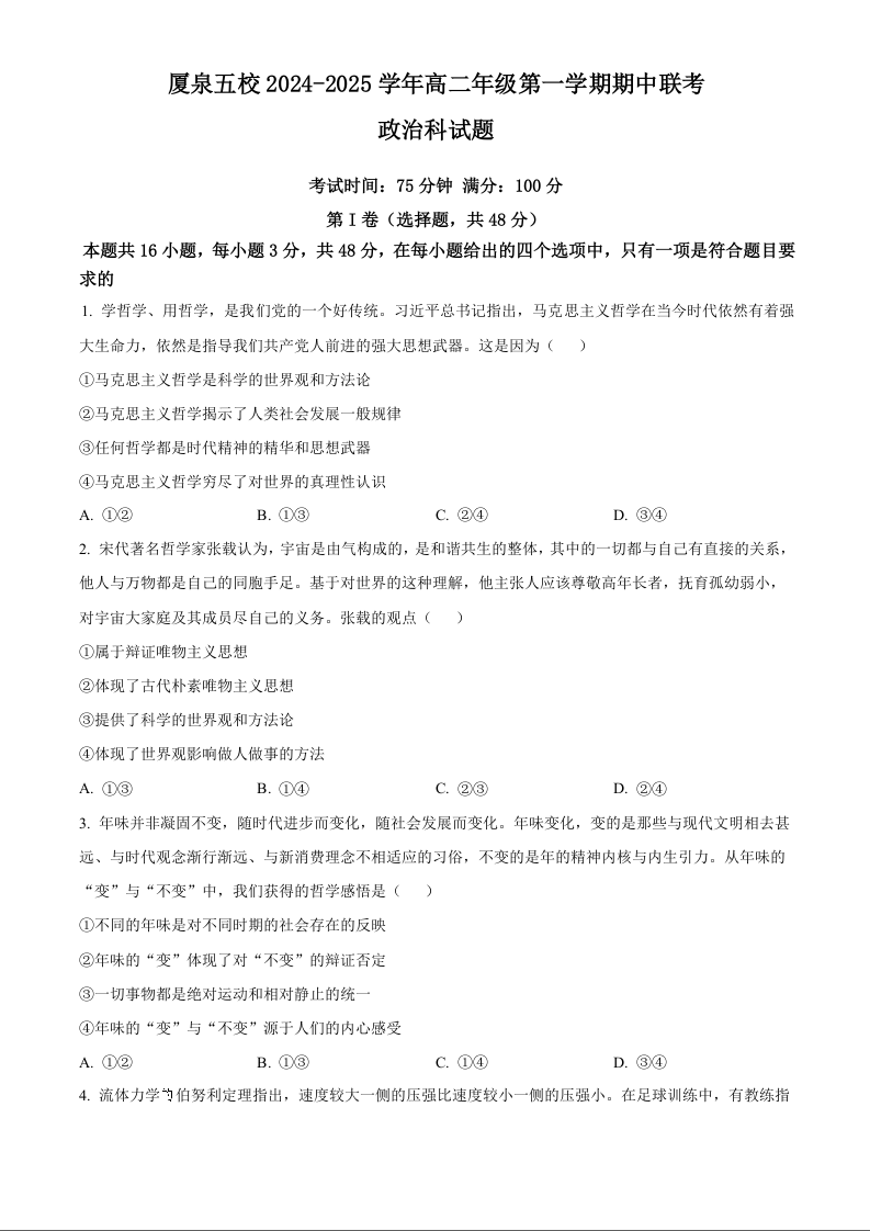 福建省厦泉五校2024-2025学年高二年级第一学期期中联考政治+答案