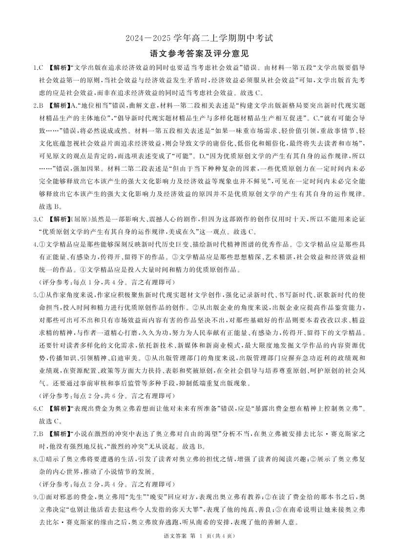 甘肃省酒泉市金塔县等四地2024-2025学年高二上学期1期中考试语文答案