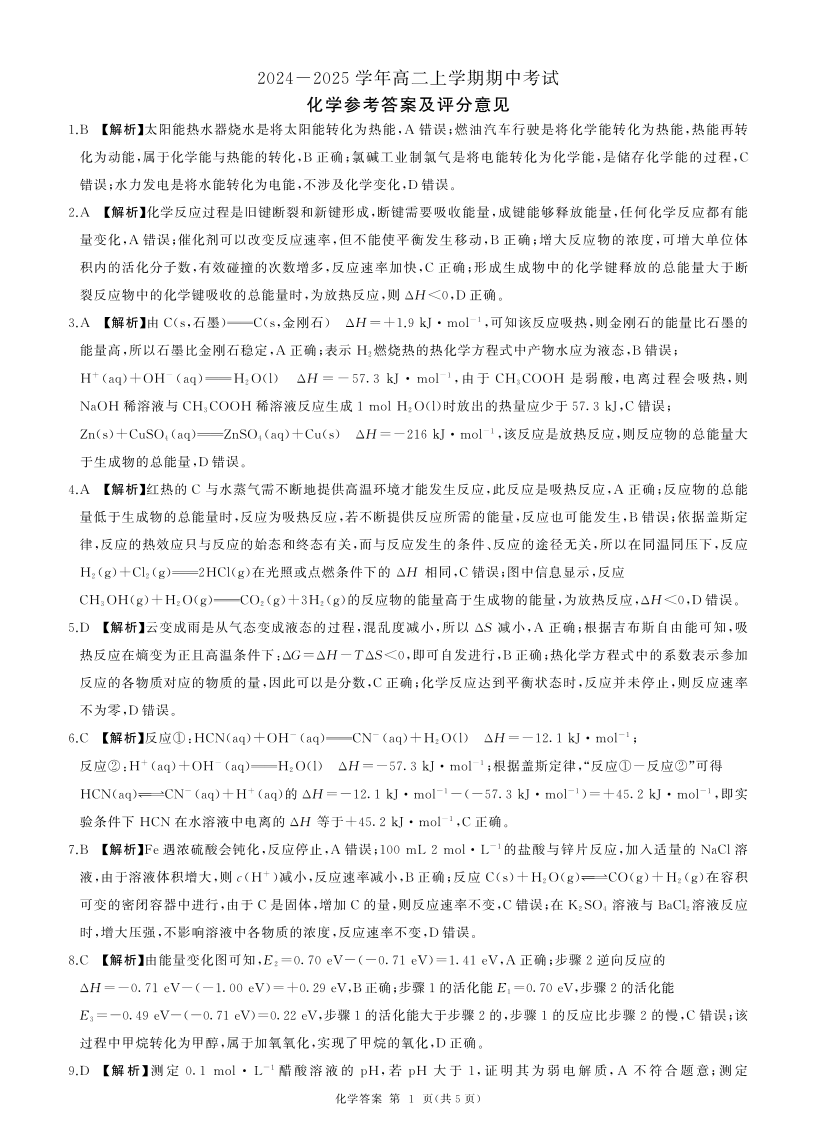 甘肃省酒泉市金塔县等四地2024-2025学年高二上学期1期中考试化学答案