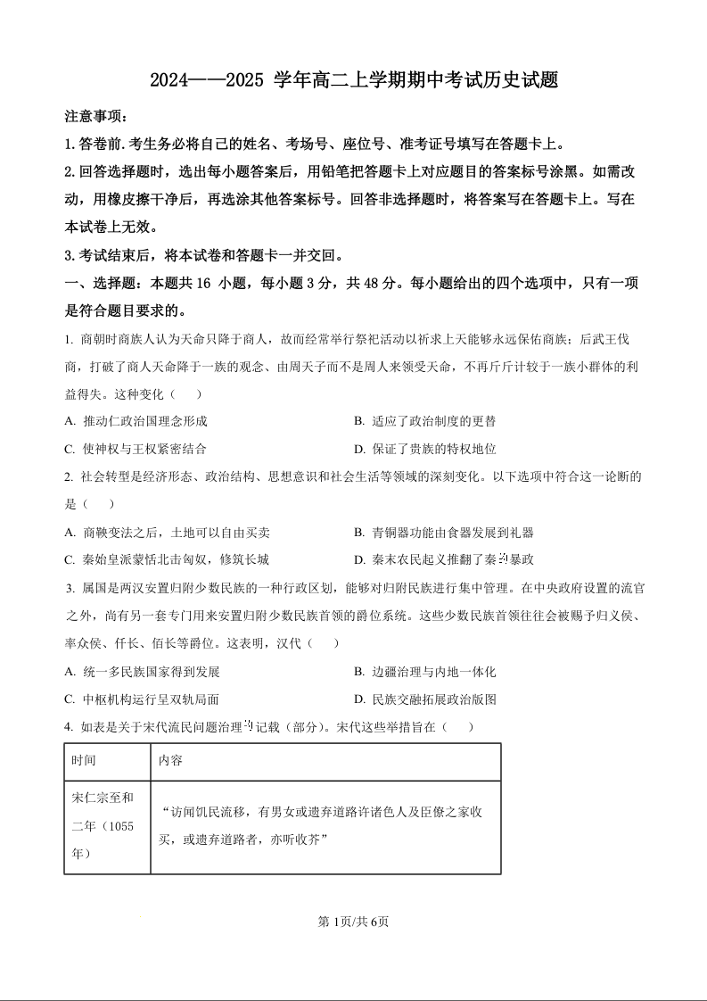 甘肃省酒泉市金塔县等四地2024-2025学年高二上学期1期中考试历史试题(原卷版)