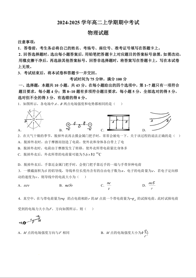 甘肃省酒泉市金塔县等四地2024-2025学年高二上学期1期中考试物理+答案