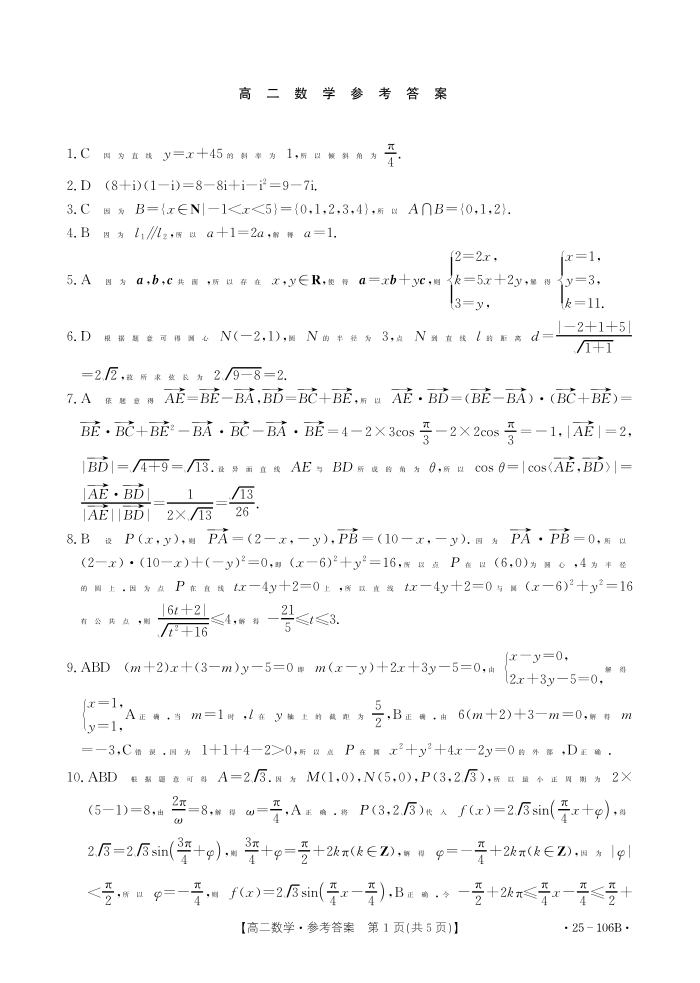 广东省2024-2025学年部分学校高二上学期期中联合质量检测数学答案