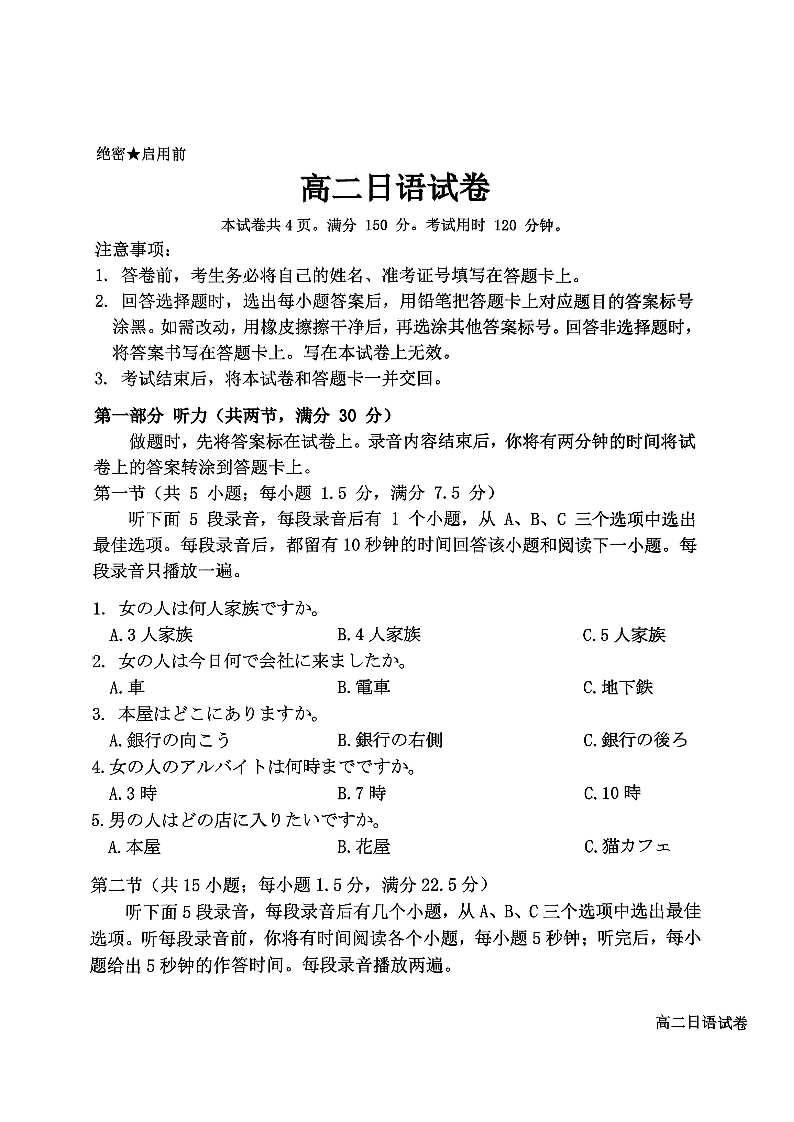 广东省2024-2025学年部分学校高二上学期期中联合质量检测日语