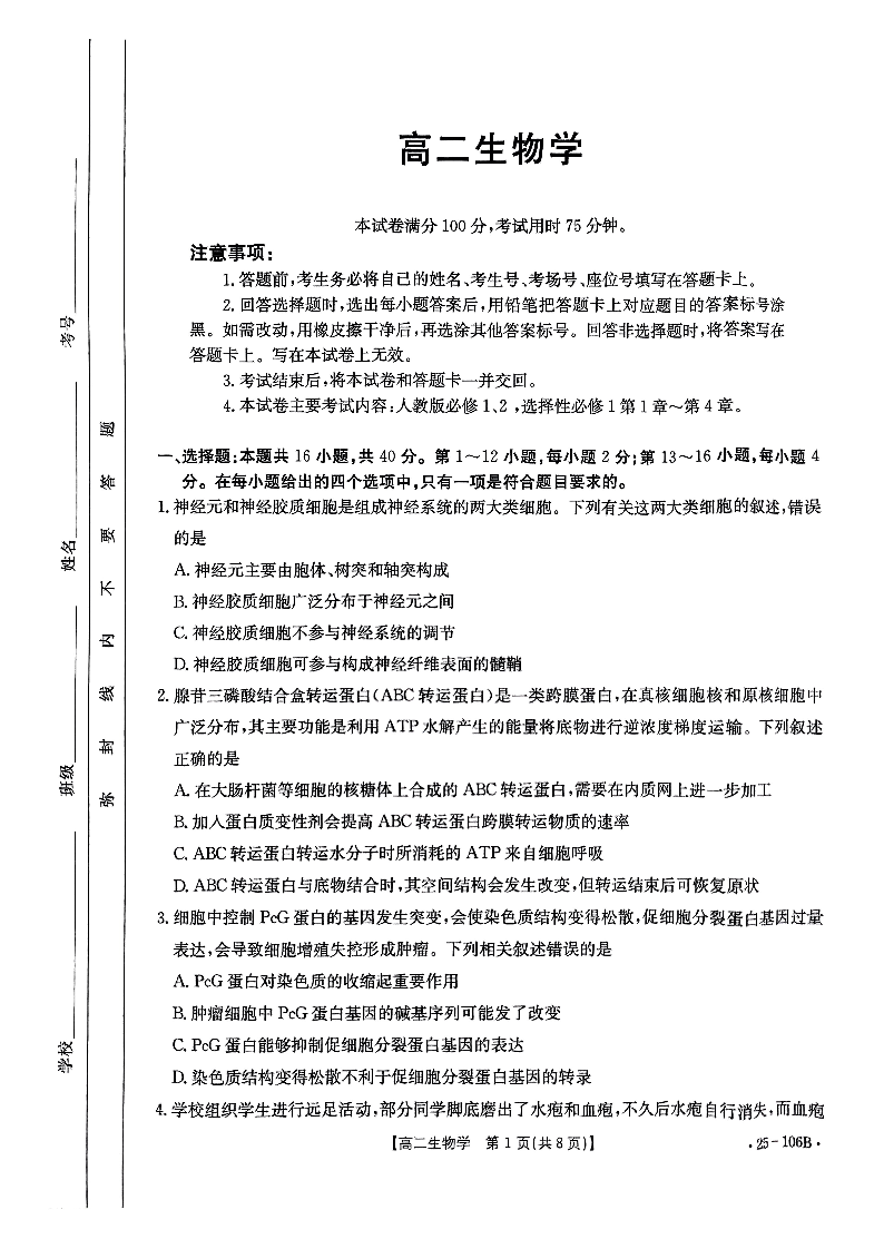 广东省2024-2025学年部分学校高二上学期期中联合质量检测生物