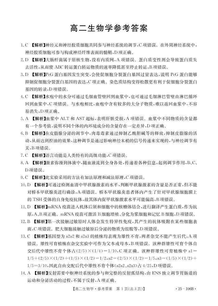 广东省2024-2025学年部分学校高二上学期期中联合质量检测生物答案