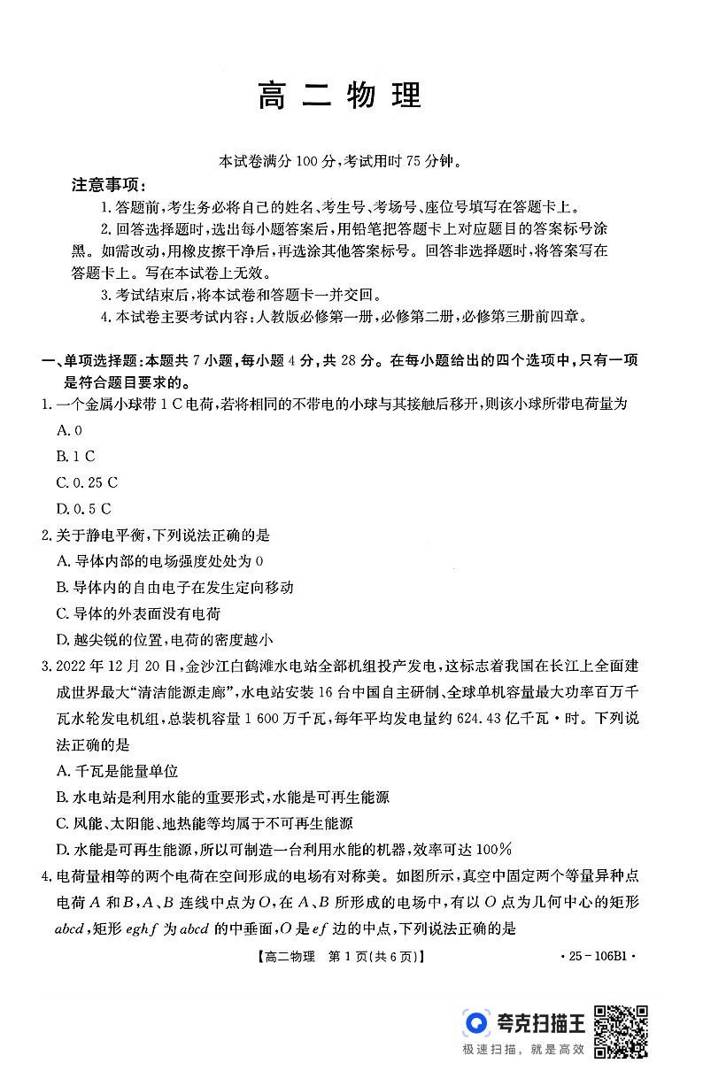 广东省2024-2025学年部分学校高二上学期期中联合质量检测物理B1