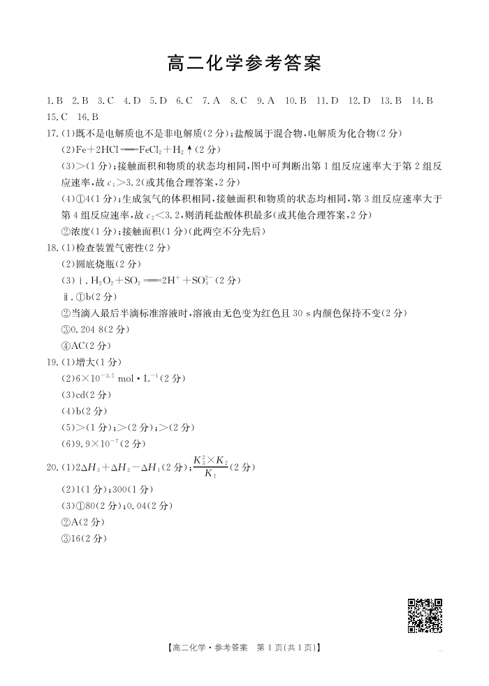 广东省部分学校2024-2025学年高二上学期期中联合质量检测化学答案